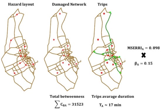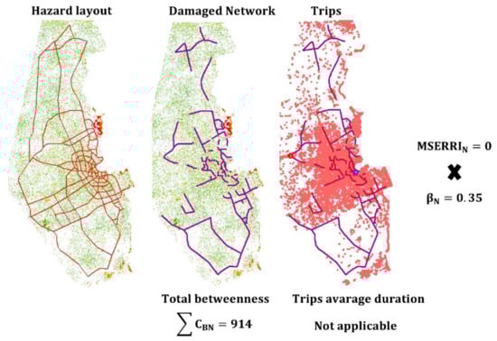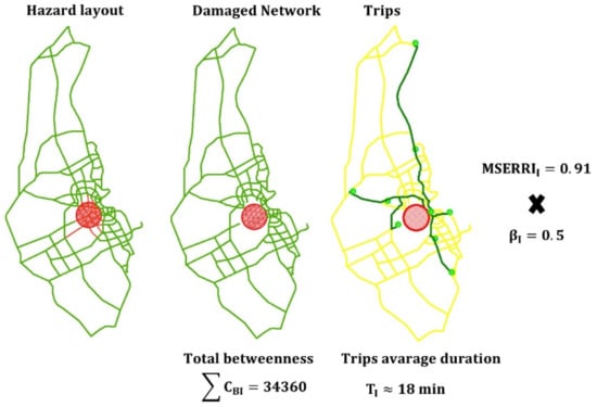 Average travel time increased slightly, causing a decrease in the performance metric. The increase in average travel time, equal to almost 2 min, can be attributed to the loss of several edges (roads) passing through the impacted buffer area. This loss of direct roads, especially close to the city center, forced the use of longer alternatives and additional turns in certain trips, while the rest of the trips remained unimpacted; subsequently, the overall degradation in this performance metric was equal to almost 11%. The impact of intentional attacks and the resulting values are shown in Figure 4, with a resilience index equal to MSERRII = 91%, resulting from using the previously presented weighting factors (αG = 0.5, αL = 0.5).
