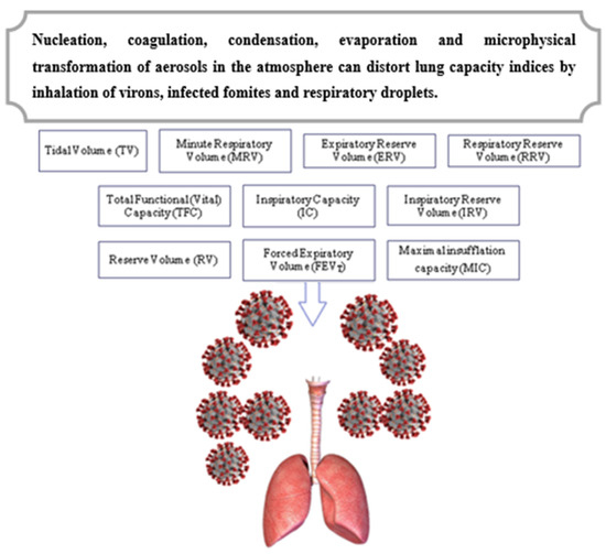 Some spirometric indices affected by exposure to inhalable viral aerosols and microdroplets during routine or periodic activities. Key: TV: Amount of inhaled and exhaled air during a normal respiratory cycle in the lung. MRV: Amount of tidal air passing in and out of the lung per minute. ERV: Amount of air that can be expired beyond the tidal volume. RRV: Tidal volume + expiratory reserve volume; obtained by taking a deep breath (maximal breathing) and exhaling all the air from the lung or VC = by adding IRV + TV + ERV. FEVT: Timed vital capacity, which determines impairment of pulmonary function or mechanical condition of the lung, e.g., dyspnea (shortness of breath), asthma and emphysema. IC: Measures maximum voluntary ventilation or IC = IRV + TV or VC-ERV. IRV: Amount of gas that can be inhaled after normal inhalation, filling the lungs with tidal air. RV: Amount of air left after expiratory reserve volume that cannot be forcibly expelled. MIC: Measures glossopharyngeal breathing (air stacking) or maximum volume of gas that can be held within closed glottis.