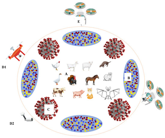 A compendium of environmental variables with potential to impact animal welfare and smart farming in the COVID-19 era. Livestock and other species serving as natural reservoirs for coronavirus strains (A); atmospheric aerosols (B); coronavirus strain (C); biosensors (D1,D2); robotic drone (E).