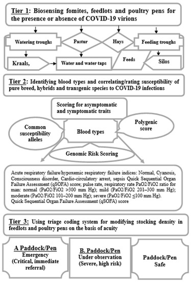Globally, coronavirus invasion and lethality are causing huge economic losses in the livestock and meat industries, with emergency mass culling and excess mortalities of meat species and fur producing mink in North America, Nordic countries and regions seriously hit by the virus. Susceptibility to infectious diseases has been linked with the ABO blood phenotypes [83]. The ABO blood group, in particular, plays a functional role in viral infections. Intriguingly, patients with non-O blood group have a higher risk for COVID-19 infection when compared to O blood groups, and the ABO blood group can influence coagulation factor VIII (FVIII) [84,85]. Blood type consists of antigenic factors of the red blood cells which represent inherited polymorphic traits among individuals. The allelic products of a given genetic locus are the blood group system. In other words, blood types are inherited traits of the red blood cells (RBCs) termed positive (A+) or negative (A−) and determined by polymorphic and antigenic components of the RBC membrane [86]. The presence or absence of species-specific antigenic molecules on the surface of red blood cells (erythrocytes) determines the blood types. A, B, C, F, G, H, I, K, L and M are symbols used for designation. When antigens exist as protein molecules or oligosaccharide sugars above the cell surface, they induce immune-mediated reactions. While no disease results from lack of expression of ABO blood group antigens, a number of illnesses may change an individual’s ABO phenotype. Animal erythrocytes have cell surface antigens that go through a polymorphic process and give rise to blood types. The systems are identified by a letter: A, B, C, D, E, H, I, J, K, L, N, P and R. For instance, bovine species such as cattle have 11 major blood group systems: A, B, C, F, J, L, M, R, S, T and Z. Avian species such as domestic chickens have 13 alloantigen systems in the nucleated red blood cells and other cell types. In the context of the coronavirus pandemic, sampling or validating blood types of various avian and mammalian species, sequencing antigenic factors and correlating such findings with herbivory and heritable susceptibility to COVID-19 infection is a knowledge gap that has not been addressed to confirm susceptibility indices of various livestock breeds exposed to different environmental dynamics. Again, apart from omics tools for syndromic detection, there is no evidence of multiple pleiotropic expressions, multiplicity of infection, autoimmune mechanisms and blood typing markers coding for susceptibility to SARS-CoV-2 or its mutated strains across avian, bovine, ovine, porcine or semiaquatic breeds and neonates. While seeking answers to these issues, using a triage colour-coding system and modifying livestock stocking density (which is a way of mimicking social distancing in humans) for contact tracing of confirmed vs. probable cases among livestock looks promising for determining positivity index in paddocks or poultry pens to raise biosecurity and safeguard against viral outbreaks on livestock farms (Figure 3 and Figure 4).