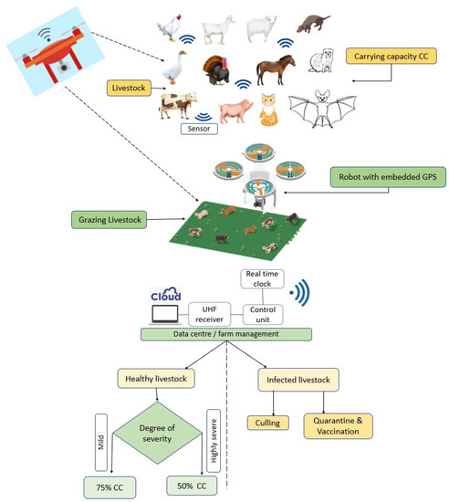 As shown above (Figure 5), the modified SEIR compartmental mathematical model, which we could call the SEIQR model for exposure dynamics and transmission of SARS-CoV-2 variants, implies that any animal in a population belongs to one of five states: susceptible (S), exposed (E), infectious (I), quarantine (Q) and recovered (R). The animals in the susceptible states are assumed to be healthy but have no immunity against the virus, and thus they can contract the virus at any time. The animals in the exposed state are vulnerable to the virus. The infected ones can harbour and transmit the virus to any organism they come in contact with. Any animal that is infected either recovers naturally from the disease or will be moved to the quarantine state. Some animals can also recover from the quarantine state. It is assumed that a recovered animal has a low (but not zero) chance of reinfection. The susceptible animals move to the exposed compartment (𝐸) at a rate 𝛽1 (𝐼/𝑁). Animals in the exposed compartment move to the infectious compartment (𝐼) at a rate 𝛽2. Natural death occurs at a rate 𝜇 in all the five compartments. The rate of death due to COVID-19 is α. The rate of recovery (R) for infectious animals is 𝛽3. The rates at which the infectious animals enter the quarantine compartment (Q) and return to the infectious compartment are 𝛽4 and 𝛽5, respectively. The compartmental model culminates in a five-dimensional system of ordinary differential equations (ODEs) as seen in Equations (2)–(6). Figure 6 shows the drone powered by biosensors and radio modem system to provide daily data on animal welfare including the Ultra high frequency (UHF) receiver that uses radio waves, the robot which contains an accelerometer sensor and GPS system network. This is an automatic system that responds to ambient temperature fluctuations and triggers at a threshold with an accurate precision of location of grazing livestock and time. The cloud provides a petabyte of data processing and storage system. The output is decision-based information that is available in real time. The entire system can be effectively utilized for biosensing the outbreak of infectious diseases in livestock industry.