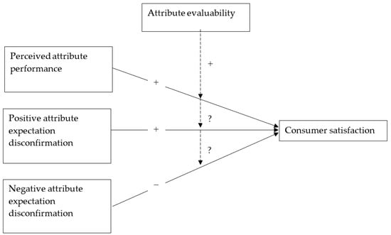 Theoretical effects of attribute perceptions on consumer satisfaction moderated by attribute evaluability (+ and − indicating positive and negative effects, respectively. The question marks denote theoretically unknown moderation effects).