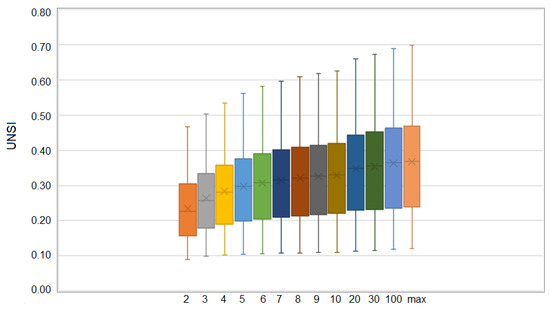Two tests were carried out to select the most adequate value of . On the one hand, different values of were taken (2, 3, 4, 5, 6, 7, 8, 9, 10, 20, 30, 100, maximum) to check where the greatest aggregation variation occurs. Evidently, as a result of one of the properties of the UNSI, it grows if grows. However, it stabilizes from a certain value of . Figure 1 and Table 5 show that this occurs with = 3.