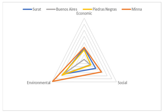 This focus, adopted from the multidimensional measurement of poverty [29], provides very interesting novelties. Firstly, it encourages cities not to fall into the trap of complacency upon finding certain aspects concerning sustainability in which they need to improve—even though they may be well-placed in the urban sustainability ranking. Secondly, this focus uses an aggregation technique that avoids compensation between indicators with good results and those that present unsustainability in such a way that the relevant information is not “diluted” and lost among the good results. Thirdly, it identifies not only where a city’s problems lie, but also how important they are, given that it scores the importance of each sustainability problem between 0 and 1; the closer the score is to 1, the worse the problem. Fourthly, the composite indicator also has the possibility of being deconstructed in order to know which dimension—economic, social or environmental—most contributes to the unsustainability.