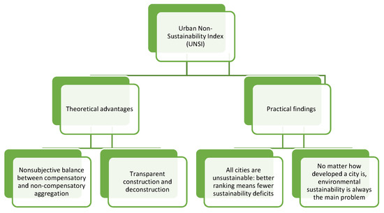 Given the problems identified in the study of urban sustainability, which have been referred to in the previous paragraphs, this article proposes an innovative and alternative focus in this field, with the aim of developing a synthetic or composite indicator, the Urban Non-Sustainability Index (UNSI).