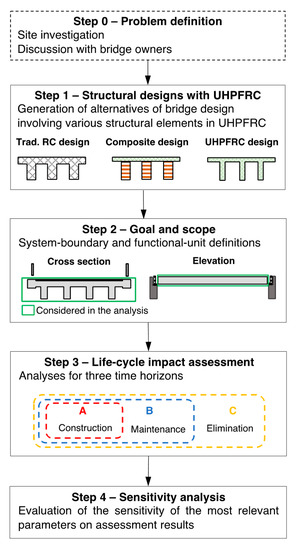 Comparing the environmental footprint of structural designs is challenging and requires several hypotheses to provide accurate results. The proposed methodology includes several steps (Figure 1). Once the main constraints of the problems are set, such as bridge dimensions and execution requirements, several structural designs are generated (Step 1). These designs typically involve various structural elements made with UHPFRC. For example, a full-UHPFRC bridge and designs made of a composite solution are compared with a conventional structure involving reinforced concrete without UHPFRC.