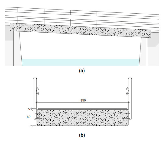 The first bridge design is a conventional RC structure. This structure involves a cast-on-site slab (Figure 3). The required concrete volume is 25 m3, and reinforcement involves 120 kg/m3, representing 2670 kg of steel. A conventional waterproof layer (5-mm thick) and an asphalt pavement layer (80-mm thick) are included in the LCA as this pavement is required for RC structures. A conventional C30/37 is considered, and its environmental impacts are taken from the KBOB database. The mix’s design and the main characteristics of this mix are presented in Table 1.