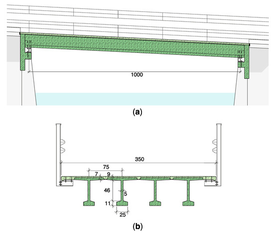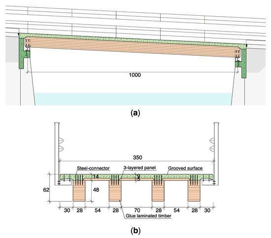In this section, the timber–UHPFRC composite bridge is presented. In this structure, the four main girders (depth of 530 mm; width of 260 mm) are made of glued laminated timber (GL28c) from Swiss wood (Figure 4). The UHPFRC slab has a thickness between 85 and 140 mm. The shear connection between the timber and the UHPFRC is made through reinforcement bars. The UHPFRC deck is also reinforced transversally using 24 rebars with diameters of 14 mm. This deck is cast directly on wooden panels and also serves as a protective layer for the timber elements, avoiding the requirement of a waterproofing layer. No maintenance is thus expected on the timber girders over the bridge’s use span as the timber will remain dry thanks to the UHPFRC deck [44]. The UHPFRC top surface is grooved to enable vehicles to pass directly on the deck, avoiding the necessity of asphalt pavement.