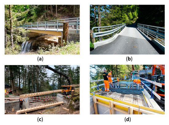 Rigi Bridge and its construction: (a,b) bridge photographs; (c) installation of timber girders; (d) Casting of UHPFRC.