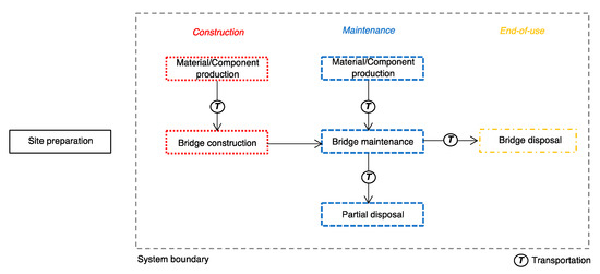 Once bridge design alternatives are generated, the system boundaries and the functional unit must be defined for the LCA (Step 2). System boundaries explicitly define processes included in the comparison, here, the cradle-to-grave comparison of bridge designs over a given service duration. Similar processes related to bridge elements involved in all design alternatives, such as bearing devices or railings, can be excluded from the system as they have a neutral effect on the bridge design comparison in terms of environmental impacts.