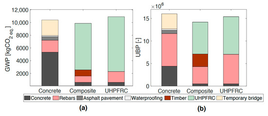 Influence of using an environmentally friendly UHPFRC on the bridge’s ecological footprint in terms of global warming potential: (a) Timber–UHPFRC composite bridge; (b) UHPFRC bridge.