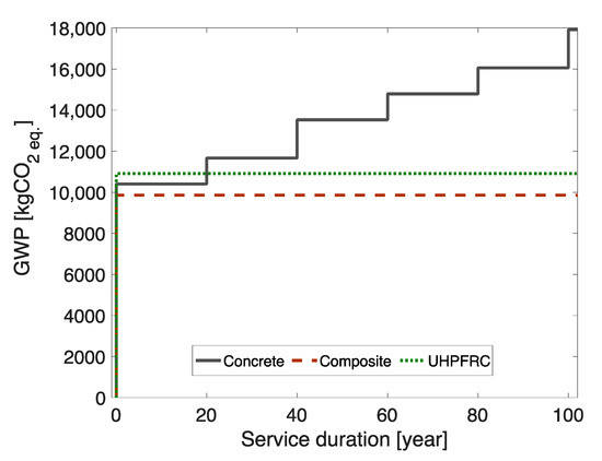 The environmental impacts of bridge design are therefore assessed with respect to the service duration in Figure 10, as maintenance is typically performed regularly. For the concrete bridge, it is assumed that the asphalt pavement and waterproof layer are replaced every 20 years, and significant maintenance on the concrete structure is performed every 40 years. No maintenance is expected on the structures of the UHPFRC and composite bridges.
