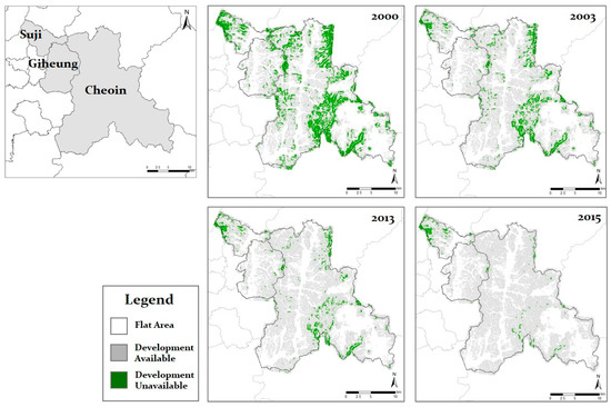 Repeating the relaxed ordinance resulted in the percentage of land that could be allowed for development reaching up to 98% of the city. Figure 3 shows the areas where development is available according to the regulation revisions from 2000 to 2019. The white areas are flatland, areas with less than a slope of 5 degrees. The grey areas are where development is possible, and the green area is the forest where development is not allowed. Between 2000 and 2015, the green area significantly decreased, as regulations were repeatedly eased. Table 2 shows the areas and proportions of the land where development is allowed according to the 2015 regulation, which was the most relaxed regulation. The total area available for development is 98% for the entire city and 99.3% for Cheoin.