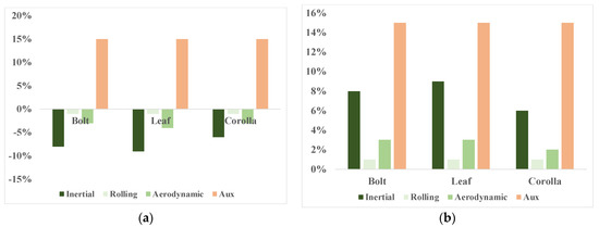Figure 6 shows the change in energy consumption per distance traveled for the representative vehicles relative to the original fuel consumption ratings (i.e., L0). A conversion factor for BEVs of 33.7 kWh per gallon of gasoline (8.91 kWh per liter) was used [