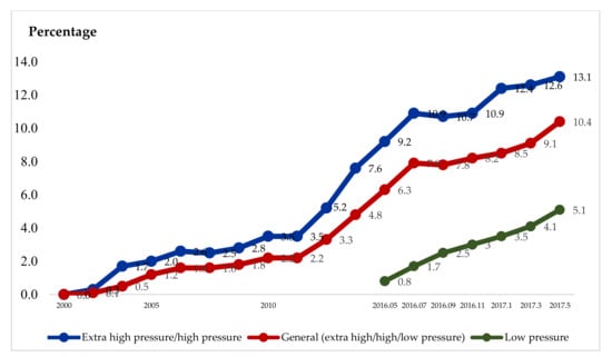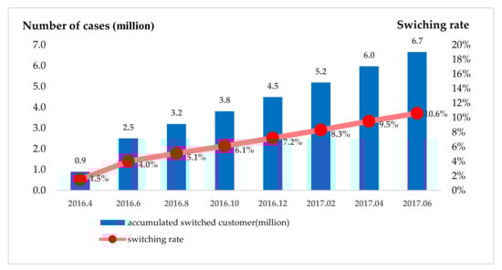 During the post-Fukushima period, deregulation policies and the liberalization of the electricity and gas market compelled energy firms to focus more strongly on innovative and newer technologies, rather than on institutional barriers and highly regulated markets to reduce costs and ensure safer environmentally sourced power. The institutional reforms were intended to position Japan in a competitive electricity market, with prices set on the basis of supply and demand [31]. As of 2016, the Japanese power market was valued at about JPY 18.2 trillion, out of which the regulated energy sector accounted for JPY 8.1 trillion before competition was opened in 2016 [32]. These developments served as a powerful incentive for existing firms to realign themselves with the new institutional landscape and for new companies to penetrate the newly liberalized market. Regional monopoly companies began relinquishing their dominance in the market and joining the competition in one another’s markets. International markets also became targets for greater competition. For example, instead of heavily relying on trading companies for import fuels, Japan Energy Era, Chugoku Electric, and Chubu Electric started investing in overseas energy projects [33]. Along with the advancement of liberalization, households switched from monopolized electric companies to newly emerging electric power companies, with the number of switching consumers reaching 10.6% in June 2017 (Figure 1) [34]. This increase paved the way for an expansion of the market where new electric companies operate—A development that reduced the electricity pressure used in households and enabled the use of extra high and high pressure by factories. The market share of new electric companies accordingly reached 11.3% in June 2017 (Figure 2) [34]. The deregulation and liberalization of the electricity market accorded customers the right to choose electricity companies from which to acquire services. Amid this backdrop, the perceptions of customers have become increasingly important in the selection of power providers.