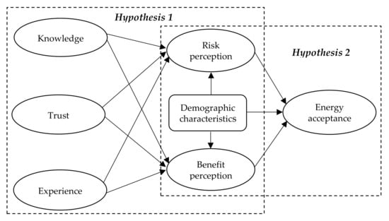 Trust, likewise, plays a vital role in an individual’s perceptions regarding energy decisions. Under insufficient experience of a particular energy source, trust can alter an individual’s perspectives [46,47]. To assess risks and benefits, people may rely on social trust [48] or affective information [49]. Previous studies uncovered that the trust formed in a society or the trust affected by other individuals in a society significantly influences individual perceptions of benefits and risks. In addition, perceived trust indirectly affects users’ intention to accept particular technologies via perceptions of benefits and risks. Lastly, previously published results indicated that trust leads to higher perceptions of risks and benefits [50,51,52].
