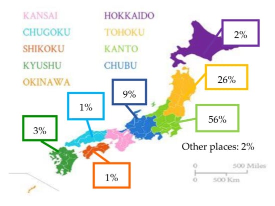 This study was carried out from September to December 2019 using a questionnaire and qualitative methods. To guide the development of a formal questionnaire and Liker scales, we conducted a qualitative survey using semi-structured interviews with key informants (age, gender, affiliation, year level, and hometown). We used a pilot study to uncover possible misinterpretations of the questions and ambiguous responses. In addition, we gathered qualitative data through focus group interviews and participant observations to help us better understand students’ perception. The empirical data collected from the survey were analyzed to determine risk and benefit perceptions regarding the main energy sources in Japan (LNG, coal, hydropower, solar and nuclear power, petroleum), the influencing factors of such perceptions, and energy acceptance among Japanese undergraduates. In addition to perceived risks and benefits as well as energy acceptance, sociodemographic information and the influencing factors of the aforementioned perceptions were indicated in the survey data. Sociodemographic information included age, gender, hometown, year level, and departmental affiliation. The information on determinants included that related to knowledge, trust, and experience. The core survey responses came from northeastern Japan, given that, after the nuclear power explosion in Fukushima in 2011, people in this region may have developed a stronger awareness of energy. Figure 4 shows the percentages of respondents hailing from different parts of Japan. A total of 151 questionnaires were eliminated because of missing data, leaving us with a final sample of 216. We hypothesized that the variables used in this study are important determinants of students’ perceptions of risks and benefits. Table 2 summarizes the definition of each variable used in our analysis.