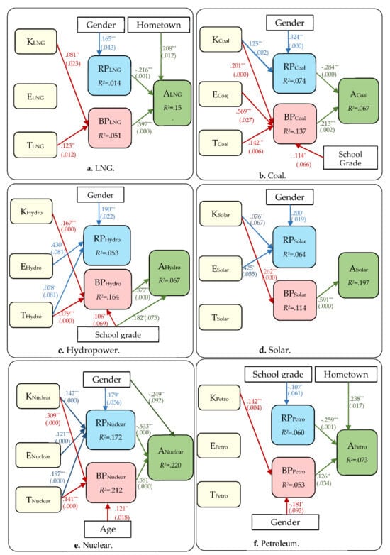 The second energy classification comprises coal and nuclear power (Figure 6b,e). Because of the long-term application of these sources, residents interact more extensively with these types of energy in daily life, as can be seen from their availing of these stable power sources, the suffering that they endured because of the nuclear accident, and air pollution. Given these interactions, the students were familiar with the advantages and disadvantages of these energy sources. Therefore, their knowledge, experience, and trust predicted their risk and benefit perceptions with respect to this energy classification. Their perceptions also strongly predicted their acceptance of these energy sources. We refer to the second category as “well-known energy.”