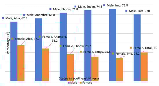 Conversely, the percentage distribution of the sex of heads of household across the states in South-East Nigeria were considered in this study (Figure 1). A greater percentage of household heads across all states of the South-East sampled were males. Only 37.7% in Abia State, 28.2% in Ebonyi State, 25.5% in Enugu State, 34.2% in Anambra State, and 24.2% in Imo State were female heads of household (test of association between the sex of heads of household and state; X2 = 109.130, p < 0.000; Cramer’s V= 0.300).