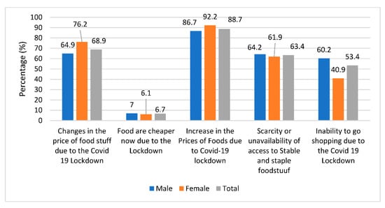 The opinion of respondents (percentage distribution) about factors affecting food access and price increase during lockdown were considered during the study (Figure 2). Responding to the questionnaire item about reasons for hunger situation faced by households, up to 68.6% of households in South-East Nigeria opined that there were changes in the prices of foodstuffs due to the COVID-19 lockdown. A significant percentage of households (88.7%) reiterated that the COVID-19 lockdown had led to an increase in the price of foodstuffs. About 63.4% of households concurred that changes in the price of foodstuffs were responsible for the scarcity or unavailability of essential and stable foodstuffs, while 53.4% of these households had the view that the COVID-19 lockdown did not allow them go out to buy foodstuffs.