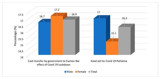 Figure 3 shows the percentage distribution of households’ participation in government interventions on hunger and food security during the COVID-19 pandemic. It depicts that the government intervention programs were not popular among households across South-East Nigeria. Only 16.9% of the households benefited from the government cash transfer program during the COVID-19 lockdown. Only 16.3% of households benefited from the government COVID-19 palliative food-aid program.