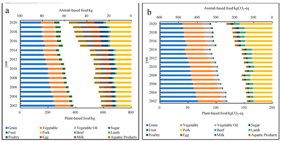 It can be seen from Figure 1a that during the study period, per capita food consumption decreased by 17.16%, from 409.00 kg in 2002 to 338.80 kg in 2020. Per capita plant-food consumption still accounted for 83.14% in 2020, and although it decreased by 1.61% annually, it was still the main type of food consumption. Per capita consumption of animal-based food maintained a higher growth rate at about 4.32%, however, the amount of consumption was still small. Since the carbon emissions in producing animal food are higher than those of plant-based food [21,26], the transformation of the food consumption structure of rural residents has promoted continuous changes in food consumption carbon emissions.