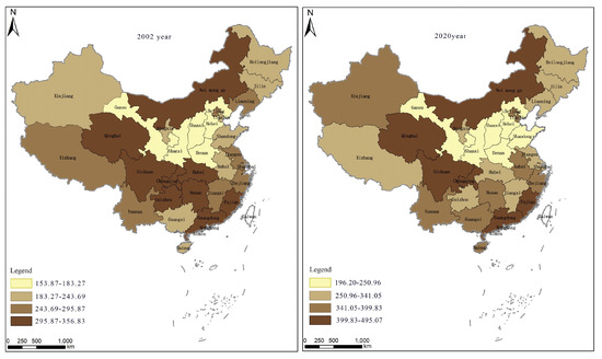 In the context of a continuous increase in rural residents’ per capita food consumption carbon emissions, we used ArcGIS 10.8 software to divide the rural residents’ per capita food consumption carbon emissions in each province into four levels from low to high; this was conducive to spatial analysis and expression. In order to save space, only beginning and ending years are reported (Figure 2).