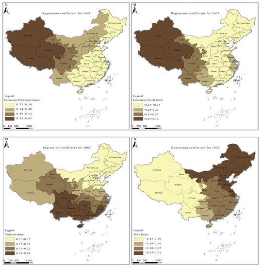 We combined Formula (5) to run the GWR model to calculate the regression coefficients of each driving factor, and divided it into four levels from low to high according to the natural break point analysis method (Jenks). Then, 2002 and 2020 were selected for visualization for the purpose of revealing the spatial heterogeneity of independent variables on dependent variables (Figure 4 and Figure 5). The results show that there was a positive correlation between the economic–preference factor and per capita food consumption carbon emissions in 2020, and the regression coefficient was higher in the west and lower in the south. Among them, Xinjiang, Tibet, and Qinghai were high-value agglomeration areas. According to the global development trend in food consumption, with improvements in economic levels, the consumption of animal-based food by residents will continue to increase [36], which will promote the increase in their food consumption carbon emissions [21]. During the study period, economic strength and residents’ income and expenditure levels in these areas were significantly improved, resulting in the influence of the economic–preference factor on the region being far greater than in other provinces.