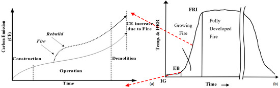 (a) Fire impacts a building’s life cycle carbon emissions [18] integrated with (b) Fire growth curve [19]. Ignition (IG), Established Burning (EB), Full Room Involvement (FRI). (Adapted with permission from ref. [18]. 2021, FM Global. And Adapted with permission from ref. [19]. 2021, The Society of Fire Protection Engineers (SFPE)).