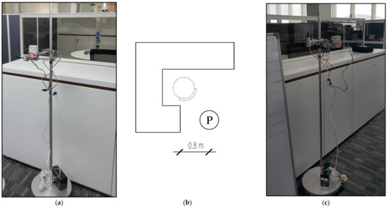 Thermal parameters such as air temperature (Ta), relative humidity (RH) and air velocity were measured with calibrated instruments (Figure 4c). In addition, regarding mean radiant temperature, the difference between indoor air temperature and mean radiant temperature was negligible under moderate outdoor conditions. Thus, the mean radiant temperature can be assumed equal to the indoor air temperature [40,41,42]. As illustrated in Figure 4a,b, instruments were installed on a pole close to the occupants’ workstations at a height of approximately 1.1 m above the finished floor, following ISO 16000-1 [43]. To avoid the radiative temperature effect on devices, 0.8 m horizontal distance with other surfaces was applied to the devices’ location. Table 2 summarises loggers’ specifications.