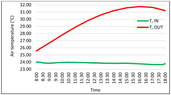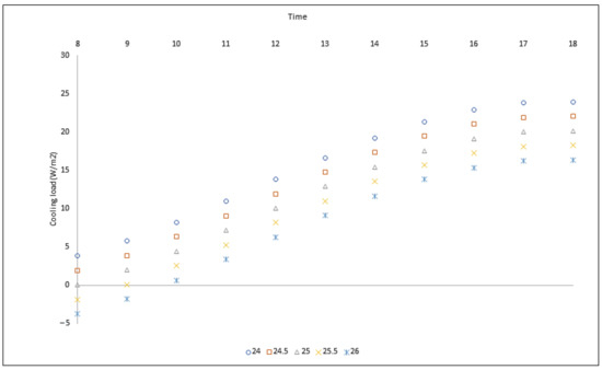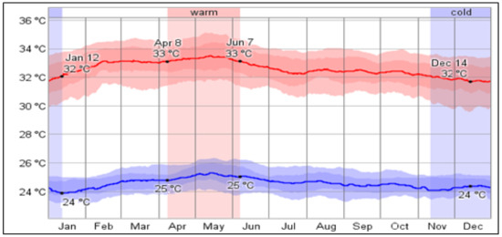 The amount of energy consumption for cooling was directly affected by outdoor temperature [48]. The geographic location of Kuala Lumpur is at latitude 3.13° N and longitude 101.68° E. Kuala Lumpur’s tropical climate is hot and humid. A ten-year period shows that outdoor temperatures of Kuala Lumpur from May to August are relatively uniform, with typical temperatures between 25.9 and 27.3 °C (Figure 5).