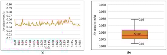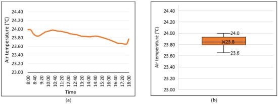 Figure 6 shows the daily average air temperature (DAAT). Overall, DAAT shows a decrease during working hours, although the reduction is not significant. During this time, DAAT shows a low variance ranging from 23.6 to 24 °C with a mean of 23.8 °C (Figure 6b). Low air temperature variance is an indication of a successfully applied mechanism to control indoor air temperature such as isolations that stop outdoor heat penetration to the indoor environment, resulting in a low air temperature variance. DAAT started at 24 °C and finished at 23.8 °C by 18:00 (Figure 6a).