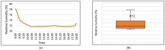 Daily average relative humidity (DARH) is depicted in Figure 7a. Overall, RH reduced during building operation hours, with a considerable reduction in early hours. The early drop was due to the HVAC system operation schedule working between 8:00 and 18:00. The HVAC system was not operational outside of working hours, resulting in a rise of RH, and thus a drop in daily average RH can be seen by the start of working hours. The DARH started at 78% and reduced to 73% by 18:00. DARH ranged—without considering the outliners by the start of working hours—from 71% to 73%, with a mean of 72% (Figure 7b).
