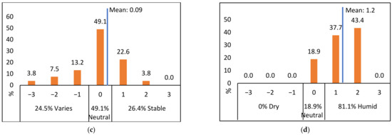 Fifty-three valid respondents were collected from 81 distributed questionnaires. The uncompleted questionnaires were considered invalid. According to Cochran [47], the sample size and response rate came with a 95% confidence level and 8% error of the building population. Females accounted for 47% and males at 53% of the responses. In addition, 51% and 49% reported ages of 30 years or above and under 30 years, respectively. Only 34% reported sitting near windows. Further information on the distribution of the respondents, including a reply to work experience in the building and type of the work office, is summarized in Table 4.