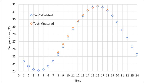 Microclimate data were collected from Meteonorm 7 software, which is a comprehensive climatological database [50]. The collected data were used to investigate the effect of outdoor conditions on the indoor environment with Spearman’s rho correlation test. The result of the test showed a positively strong significant correlation between indoor and outdoor air temperature fluctuation (r = 0.905; p < 0.05) as shown Table 5. Thus, outdoor air temperature is a significant predictor of indoor air temperature (R2 = 0.967; p < 0.05). The total equivalent temperature difference method (TETD) was applied to calculate the cooling load. The total heat transfer coefficient, time lag, and decrement factors should be considered for cooling load calculation based on TETD. The governing equations are explained in the following sections.
