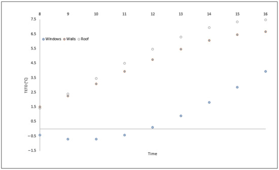 The internal cooling load was not constant and changed during the day due to changing the outdoor condition and thermal mass phenomena of building envelopes [51]. The TETD is a useful method to calculate the amount of external cooling load [52]. The following equation was applied to determine the amount of required cooling power caused by heat transfer through conduction: