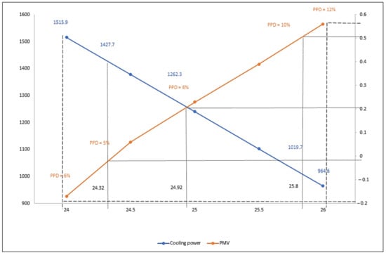 To optimize the air temperature according to cooling load and thermal satisfaction, Fanger’s PMV-PPD was employed to predict neutral air temperatures with consideration of the overestimation observed between PMV and TSV. Besides, the cooling load demand is calculated for various air temperatures, which indicated a 36% cooling load energy reduction by rising the cooling setpoint to 26 °C indoor air temperature. Under this, the occupant’s thermal satisfaction can be increased, while the cooling energy demand can be reduced.