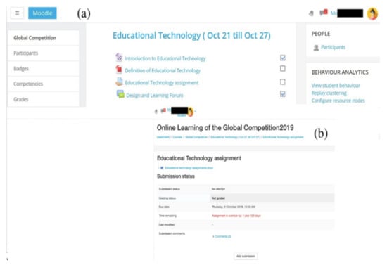 As shown in Figure 2a, the students were required to work through different learning materials (e.g., video lectures and PDF resources) each week with a final assignment to finish (see Figure 2b). The students could go to the “Design and Learning Forum” (see Figure 2a) to interact with their peers or to ask questions. Finally, the students had the option to see a list of their peers, as well as generate reports related to the collected badges, competencies, and grades (see Figure 2a).
