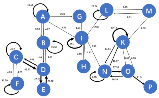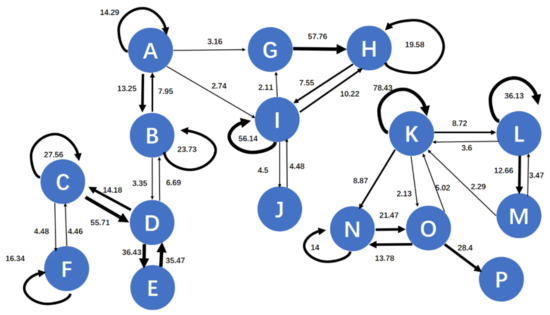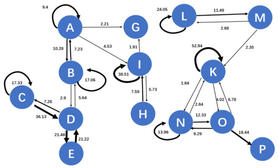 A Pearson chi-square test was then conducted and the obtained results confirmed that there is a significant relationship between the rows and columns (the rows contain the initial behaviors, while the columns contain the successive behaviors after conducting the initial ones) of the tallied frequencies (χ2 = 9111.71, df = 21, p < 0.001 for males; χ2 = 8610.23, df = 21, p < 0.001 for females). The sequential analysis results of the male and female students’ behaviors are presented in Table A2 and Table A3 (see Appendix A), respectively. Based on these tables, behavior transition diagrams were drawn (as shown in Figure 4 (male students) and Figure 5 (female students)) showing those sequences that reached a significant effect. The significant sequence is the sequence with a z-score of more than 1.96 [60]. The thicker the lines, the higher the significance value.