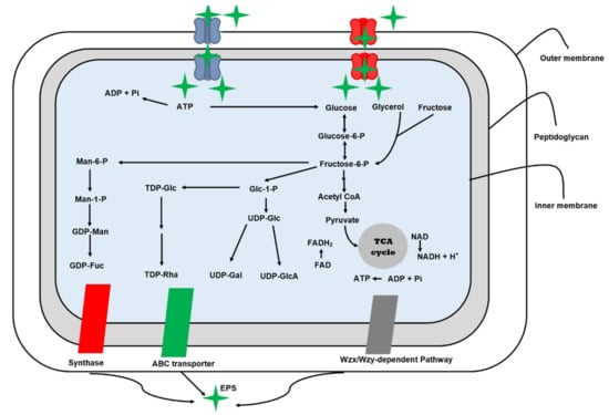 - Schmid, J.; Sieber, V.; Rehm, B. Bacterial exopolysaccharides: Biosynthesis pathways and engineering strategies. Front. Microbiol. 2015, 6, 496. [Google Scholar] [CrossRef] [Green Version]