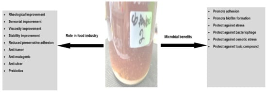 - Caggianiello, G.; Kleerebezem, M.; Spano, G. Exopolysaccharides produced by lactic acid bacteria: From health-promoting benefits to stress tolerance mechanisms. Appl. Microbiol. Biotechnol. 2016, 100, 3877–3886. [Google Scholar] [CrossRef]