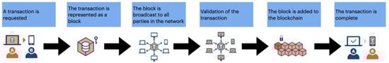 When a transaction is requested, it is converted into a hashed block, which contains information regarding date/time, sender, receiver, asset type, and quantity, and stored as candidate to be printed on the ledger [50]. Then, the block is broadcast to a network of all nodes for its validation. Once validated, the block is added to the chain of blocks, which finalizes the transaction completion.