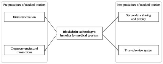 Blockchain technology is perceived as a foundational technology since potentially new social and economic systems can be based on blockchain [11]. Recently, blockchain technology and cryptocurrencies have become hot topics in tourism and hospitality research. However, in regard to medical tourism research, there exists only a handful of published articles analyzing the impacts of blockchain technology on medical tourism. Focusing on several blockchain’s features, [12] address some open questions in medical tourism regarding patient-doctor trust, procedure and risk transparency, and medical record privacy. Innovative technology such as blockchain can enable the continuous growth of medical tourism. Ref [13] states that blockchain technology can allow promotion of decentralized travel solutions and better management of electronic health record systems, help create smarter medical devices, and assist to issue tamperproof medical certificates. Ref [14] study the potential of blockchain technology to protect healthcare data hosted in a cloud-based environment. Ref [15] reveal that blockchain technology can ensure disintermediation in the medical tourism industry, increase clarity in communication, trust and transparency, mitigate a key challenge of cost rising, and facilitate collaboration between the stakeholders. Ref [16] focuses on the importance of cryptocurrency use in the medical tourism industry and statistically confirms the positive correlation between the use of cryptocurrencies and intentions of medical tourists. Yet, further academic research is needed to provide full understanding of the impacts of blockchain technology on medical tourism. There are two main stages in medical tourism: pre-procedure and post-procedure. The authors of [17] have emphasized the information technologies’ strategic role in medical tourism in terms of assisting the tourists in both the pre-procedure and post-procedure of medical tourism. However, the benefits of blockchain technology for pre-procedure and post-procedure have not been addressed in the previous literature.