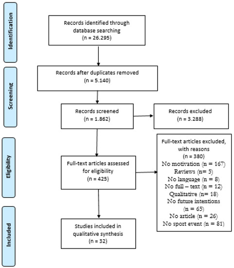For this review, we included empirical studies published in peer-reviewed journals, excluding dissertations and abstracts. Databases from grey literature, including evaluation reports, annual reports, articles in non-peer-reviewed journals, and other channels of publication, were removed. The inclusion criteria for the articles were: (i) journal articles; (ii) publications in English, Spanish, or Portuguese; (iii) motivation in sport volunteering; (iv) future intentions of sport event volunteers; and (v) articles focused on sporting events but not sport organizations. The exclusion criteria were formulated as (i) congress proceedings, book chapters, books, or other types of publications; (ii) articles that did not measure volunteer motivation; (iii) theoretical studies, qualitative approaches or reviews; (iv) articles in a language other than English, Spanish, or Portuguese; (v) articles that did not measure future intentions; and (vi) duplicate articles. It is important to note that future intentions should be evaluated after the volunteering experience, with some studies, such as Rozmiarek et al.’s [38], assessing the motivation for volunteering in a future sports event.