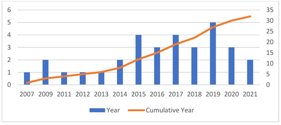 Regarding the year of publication, Figure 2 shows that 2019 was the year with the highest number of publications (n = 5), followed by 2015 and 2017, with four studies each, while 2016, 2018, and 2020 each listed three studies. Two studies were published in 2009, 2014 and 2021, and one study in 2007, 2011, 2012, and 2013 each. It is important to highlight that between 2017 and 2020, the number of studies doubled compared to the previous 10 years. Finally, regarding the type of publication, Table 3 shows that the 32 studies included were published in 26 different journals from several areas of study. The area of events showed the highest number of publications, comprising 25.0%, followed by sports and volunteering (15.6% each), and tourism represented 12.5% of the studies. To a lesser extent, three studies (9.4%) were published in the area of psychology, one in the area of hospitality (3.1%), and one in the area of leisure (3.1%). Five studies (15.6%) were published in other journals that less commonly focused on the area of volunteering and sporting events. The journal Event Management had the highest number of published studies (n = 6) and Voluntas contained two studies. The remaining journals had only one publication each.