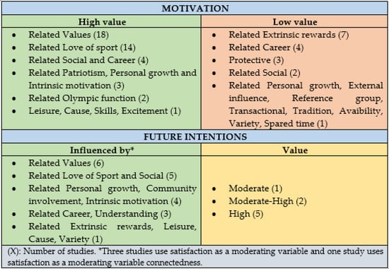 Volunteer satisfaction was a construct widely used with motivation and future intentions. Satisfaction was considered in almost half of the studies. Commitment was another construct used to assess the degree of involvement of volunteers with the sporting event, since it can affect a volunteer’s performance and motivation. Some studies have shown the influence of these constructs, either directly or as moderators of motivation, in future intentions. Bang et al. [66] found that engagement had a significant influence on future intentions, in addition to community involvement and extrinsic rewards motives. Satisfaction was a moderating variable of intrinsic motivation in the studies by Jiang et al. [74], Wu et al. [89] and Sha [75], while in the study by Johnson et al. [13] it had a direct effect on future intentions.