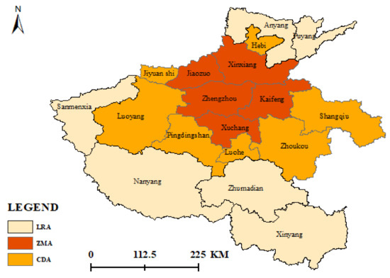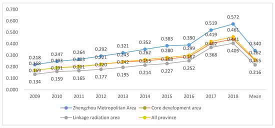 Figure 2), the resilience levels of the cities in the three major regions exhibit notable differences, but they all indicate an upward development trend. From 2009 to 2017, the average urban resilience levels in the Zhengzhou metropolitan area, core development area, and linkage radiation area are 0.340, 0.255, and 0.216, respectively, and the resilience level in the Zhengzhou metropolitan area is higher than the average level in the core development area, linkage radiation area, and province, and the lowest resilience level is observed in the linkage radiation area. This is closely related to the regional economic development level. The Zhengzhou metropolitan area is the core area of the Central Plains urban agglomeration and integrates economy, culture, industry, and population as the center. The urban infrastructure is complete, social resources are abundantly available, and the medical system and urban functions are comprehensive, so this area is resilient. The level is relatively high. From the perspective of the growth rate, the resilience level in the Zhengzhou metropolitan area rose from 0.218 in 2009 to 0.572 in 2018, an average annual growth rate of 16.2%. The resilience level in the core development area increased from 0.169 in 2009 to 2018 0.441, an average annual increase rate of 16.1%. The resilience level in the linkage radiation area increased from 0.134 in 2009 to 0.405 in 2018, an average annual increase rate of 20.2%. At present, the growth rate of the resilience level in the linkage radiation area is higher than that in the Zhengzhou metropolitan area and core development area, reflecting that the linkage radiation area exhibits a good development momentum, but the overall resilience level in the region remains lower than the national average level. The main reason is that the economic foundation of the linkage radiation area is poor, and the urban development level is relatively lagging due to the influence of various factors, such as natural variables, human factors, and historical conditions.