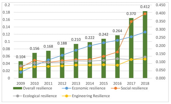Table 3 indicates that, in general, the overall resilience level and the resilience level of each subsystem increased during the initial year and by the end of the period from 2009 to 2018, and growth was more obviously encountered, indicating that the overall situation of urban resilience development in Henan Province was suitable. Specifically, in regard to each subsystem, the economic resilience level (0.0767) was the highest, followed by the social resilience level (0.0733). The economic and social resilience level indicated a steady growth trend and basically agreed with the overall urban resilience level in Henan Province. The levels were consistent, indicating that these two subsystems are the key factors promoting the overall resilience of Henan cities. In addition, the ecological resilience level (0.0465) ranked third, and the engineering resilience level (0.0369) ranked at the bottom. The advancement of ecological and engineering resilience lagged, which has become a bottleneck in the development process of urban resilience in Henan Province. On the whole, although the ecological and engineering resilience levels increased, the overall extent was limited. This yielded a small contribution to the improvement in the urban resilience development level in Henan Province; much room for future improvement remains.