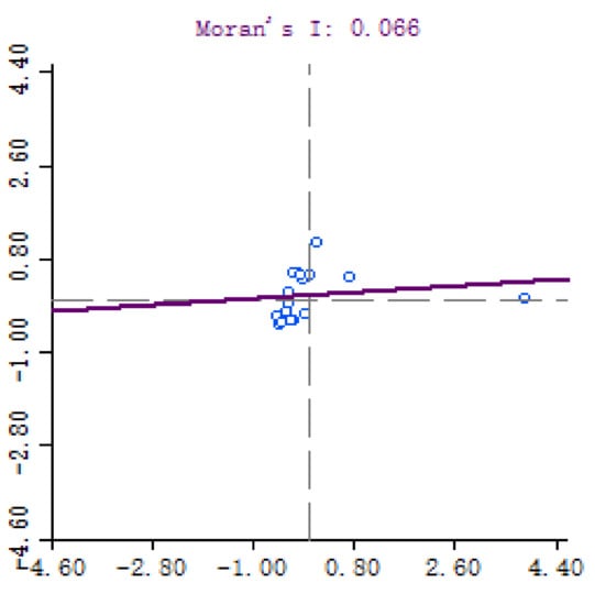 Figure 4, the Moran index of the urban resilience level in Henan Province in 2018 reached 0.066, which indicates that there was a positive spatial correlation in the urban resilience development level among the 18 prefecture-level cities in Henan Province. To more intuitively reflect the urban resilience clustering degree in Henan Province in 2018, a dynamic distribution table was compiled based on the distribution of prefecture-level cities (