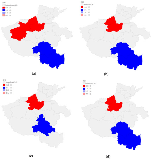 The global Moran index can analyze the degree of spatial agglomeration of the urban resilience level in Henan Province as a whole and can better reveal the spatial characteristics of the urban resilience level in Henan Province, effectively distinguishing the degrees of local spatial agglomeration and dispersion and explore local spatial development models. The local Moran index is considered for measurement purposes. GeoDa software was adopted for calculation and to generate a LISA cluster map of the urban resilience level in Henan Province to reflect the autocorrelation degree between regions. In this study, we selected the four years of 2009, 2012, 2015, and 2018 to reveal the temporal and spatial evolution characteristics of the local spatial agglomeration of the urban resilience level in Henan Province. As shown in